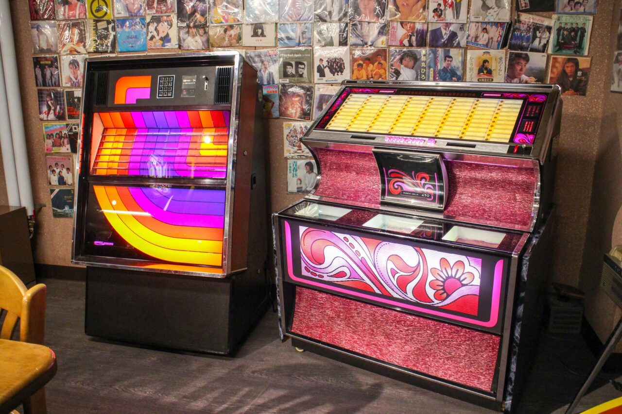 真偽を当時を知るスタッフさんに尋ねると、奥が卓球場でかつては8台もの卓球台が並び、手前はダンスホールだったそうです。その後、カラオケボックスを設置し、現在は使用されていませんが名残として看板と個室が残っています。かつては、ジュークボックスを利用してダンスホールは盛り上がっていたようですね。