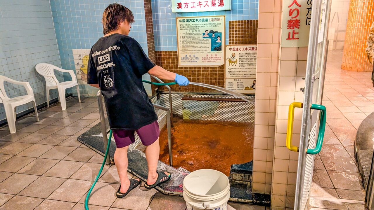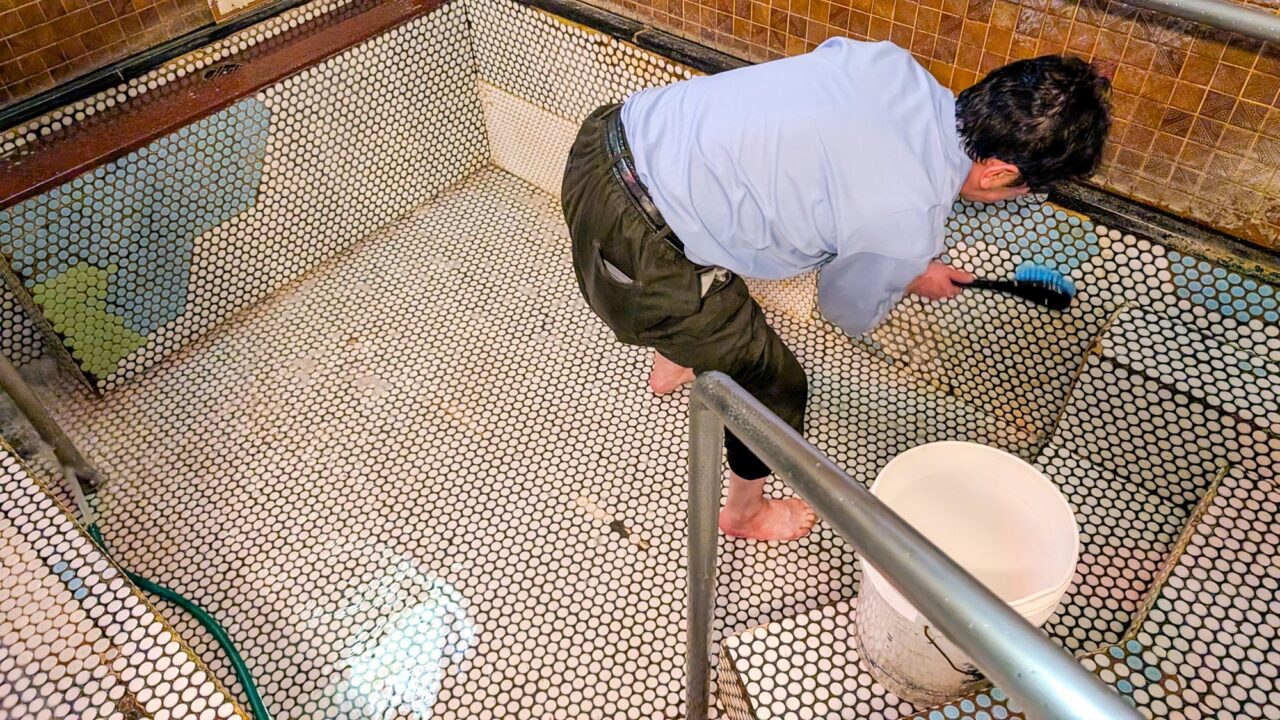 閉館後に入浴施設は清掃に入ります。清掃担当のスタッフさんが念入りに清掃しており、週何回かは、お風呂清掃のエキスパートの方が来て、社長さんと総点検をし、さらに細かく丁寧に磨きをかけるそうです。