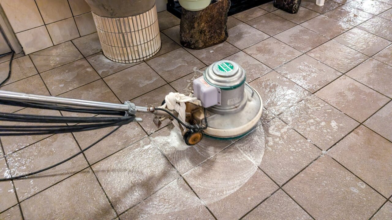 床はポリッシャーで端から端まで念入りに清掃していくそうです。