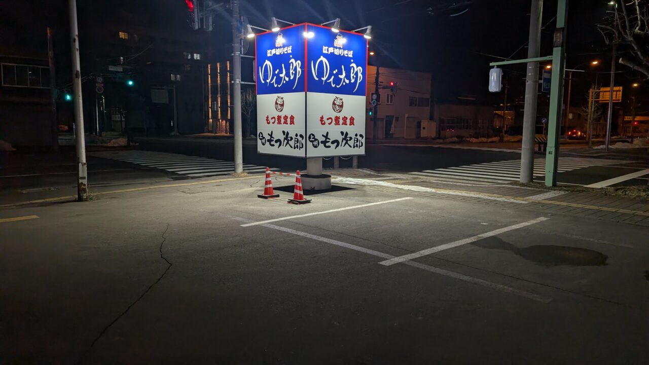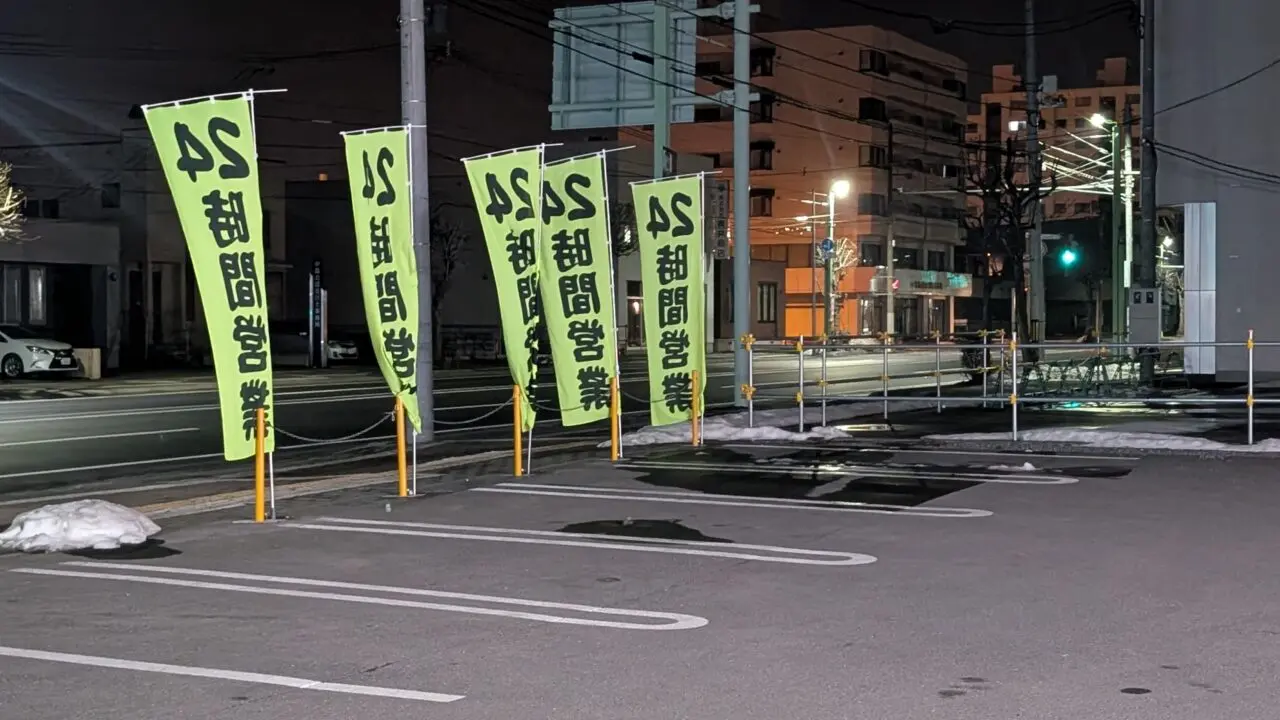 「ゆで太郎 旭川1条通13丁目店」は、いつの間にか24時間営業となっていました。目立つのぼりも立っており、夜間に利用する人も多くいるようです。