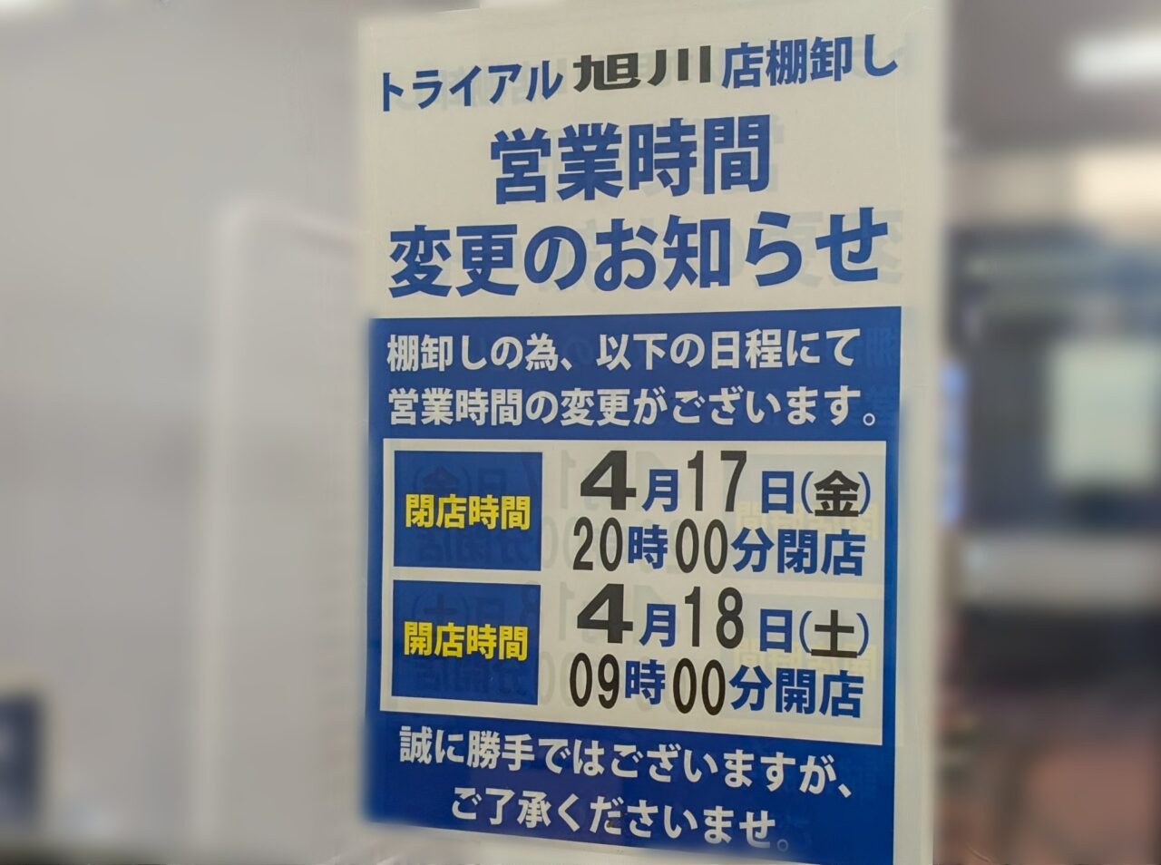 6条通の24時間営業の「メガセンタートライアル旭川店」において、2026年4月17日と18日の2日間のみ営業時間が変更となることが、店頭の案内やトライアルの公式サイトの告知により分かりました。変更の理由は棚卸を実施するからだそうです。