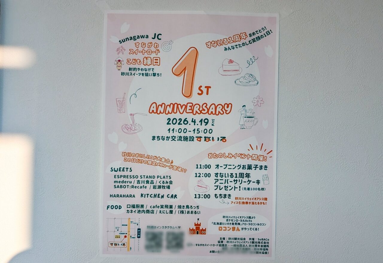 そのすないるが、早いものでオープンから1年を迎え、「1ST ANNIVERSARY」が2026年4月19日に開催されます。砂川のおいしいものが大集結するそうですよ。オープニングのお菓子まきや、アニバーサリーケーキのプレゼントにもちまきなど、注目すべきイベントが盛りだくさん。しかも「ロコンまん」も登場するそうです。ポケモン好きさんには見逃せませんね。