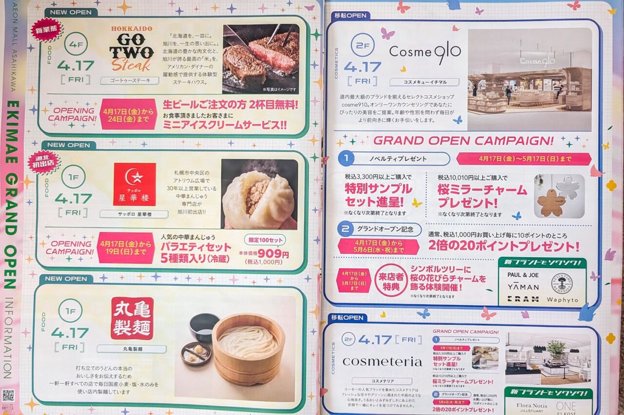 イオンモール旭川駅前の公式サイトや、投函されていたチラシを見ると、4月17日には「サッポロ 星華楼」「GO TWO Steak」「丸亀製麺」「ほけんの窓口」「デコホーム」がオープンとなります。その他、「Cosme910」が増床移設オープン、「コスメテリア」が移設オープン、「㐂久好」が改装オープンとなります。4月17日は、イオンモール旭川駅前の店内が目まぐるしく変化していそうですね。
