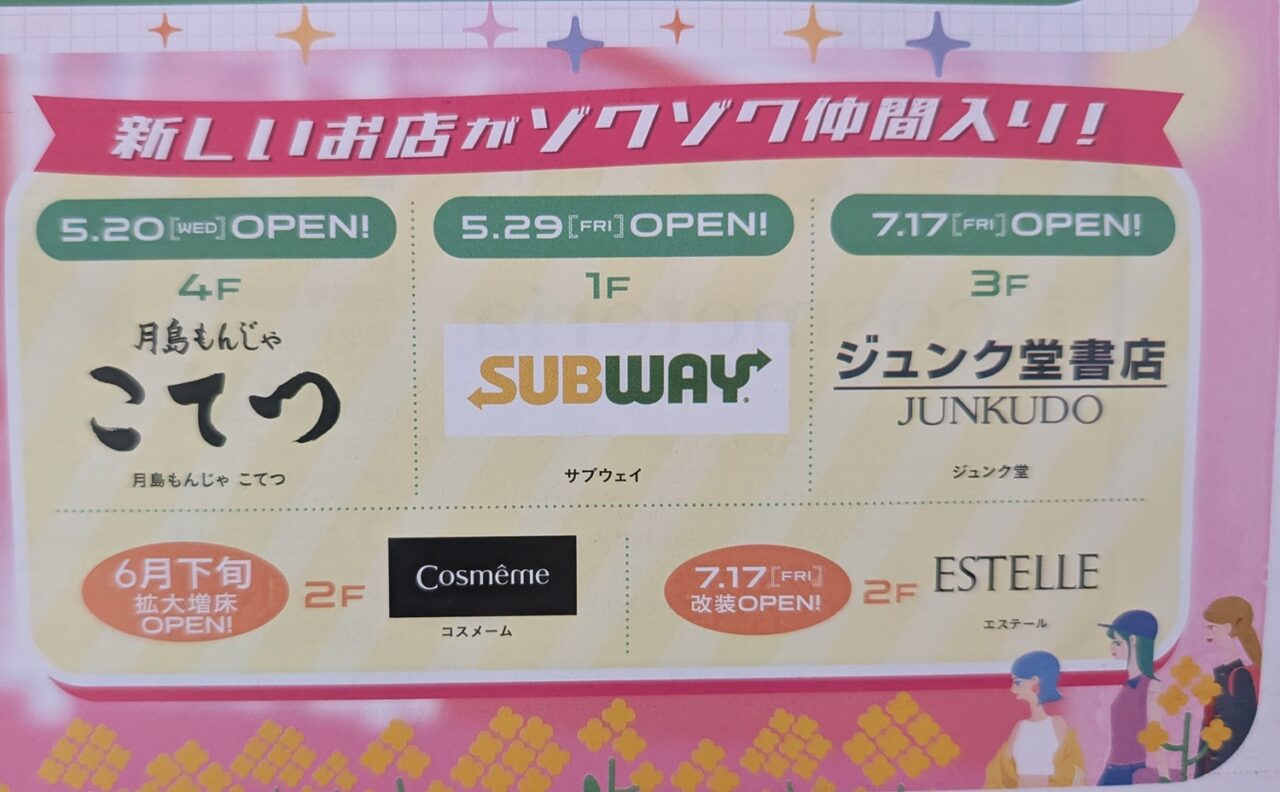 その他、4月24日には「駿河屋」、5月29日には「サブウェイ」、7月17日には「ジュンク堂書店」が新規オープン、6月下旬に「コスメーム」が増床リニューアルオープンすることは公式サイトから発表がありましたが、今回チラシには5月20日に「月島もんじゃ こてつ」がオープン、7月17日に「ESTELLE」が改装オープンするといった情報も掲載されていました。