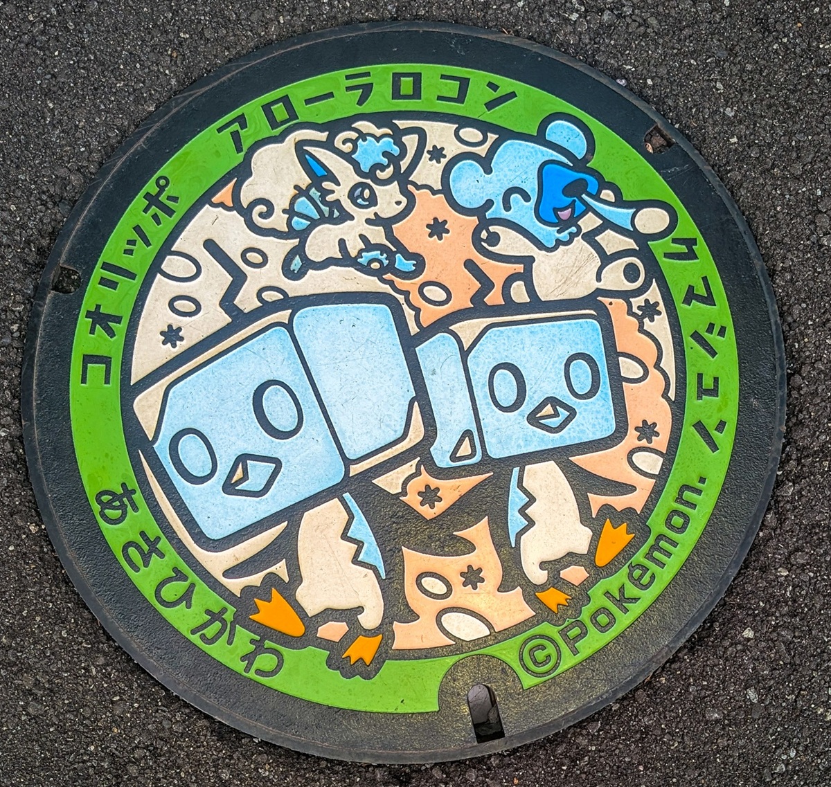 「道の駅 あさひかわ」には、ポケモンのキャラクターがデザインされたマンホール蓋で、世界に1枚しかないマンホール「ポケふた」が設置されています。「北海道だいすき発見隊」の「アローラロコン」と、こおりタイプのポケモンである「コオリッポ」、「クマシュン」が描かれていますね。人気ゲーム「ポケモンgo」で「ポケふたスタンプラリー」が2026年より始まっています。ポケふたがある場所に実際に行くと、ゲーム上でスタンプを押すことができ、全国のスタンプ付きポケふたを集めることができるんですよ。スタンプ付きポケふたはギフトとして送り合うことも可能です。