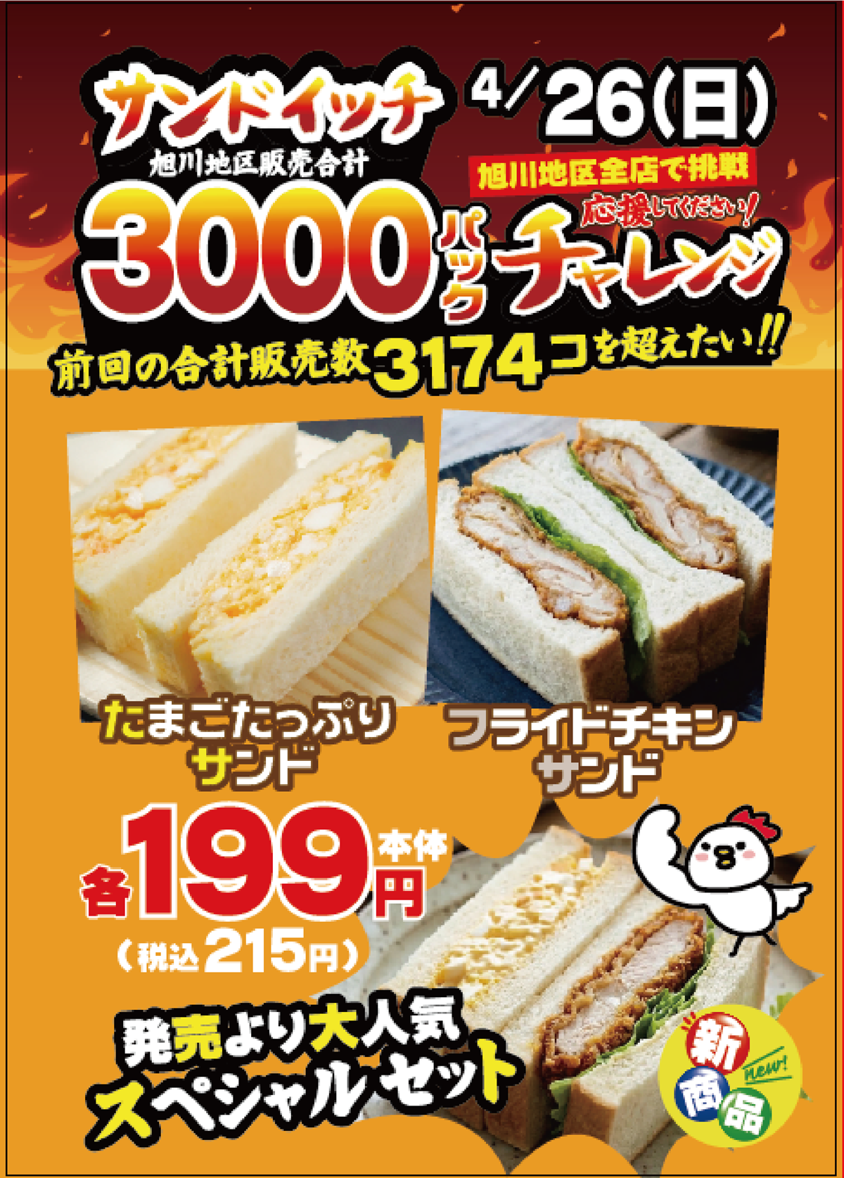 【旭川市】スーパーのサンドイッチの概念を変えるサンド!? お手頃価格でボリュームたっぷりさが大人気。前回、旭川地区で一日3,000パック以上販売した企画が再び登場。2026年4月26日の1日限り。コープさっぽろの旭川地区全体で、目指すは3,174コ以上のサンドイッチの販売!