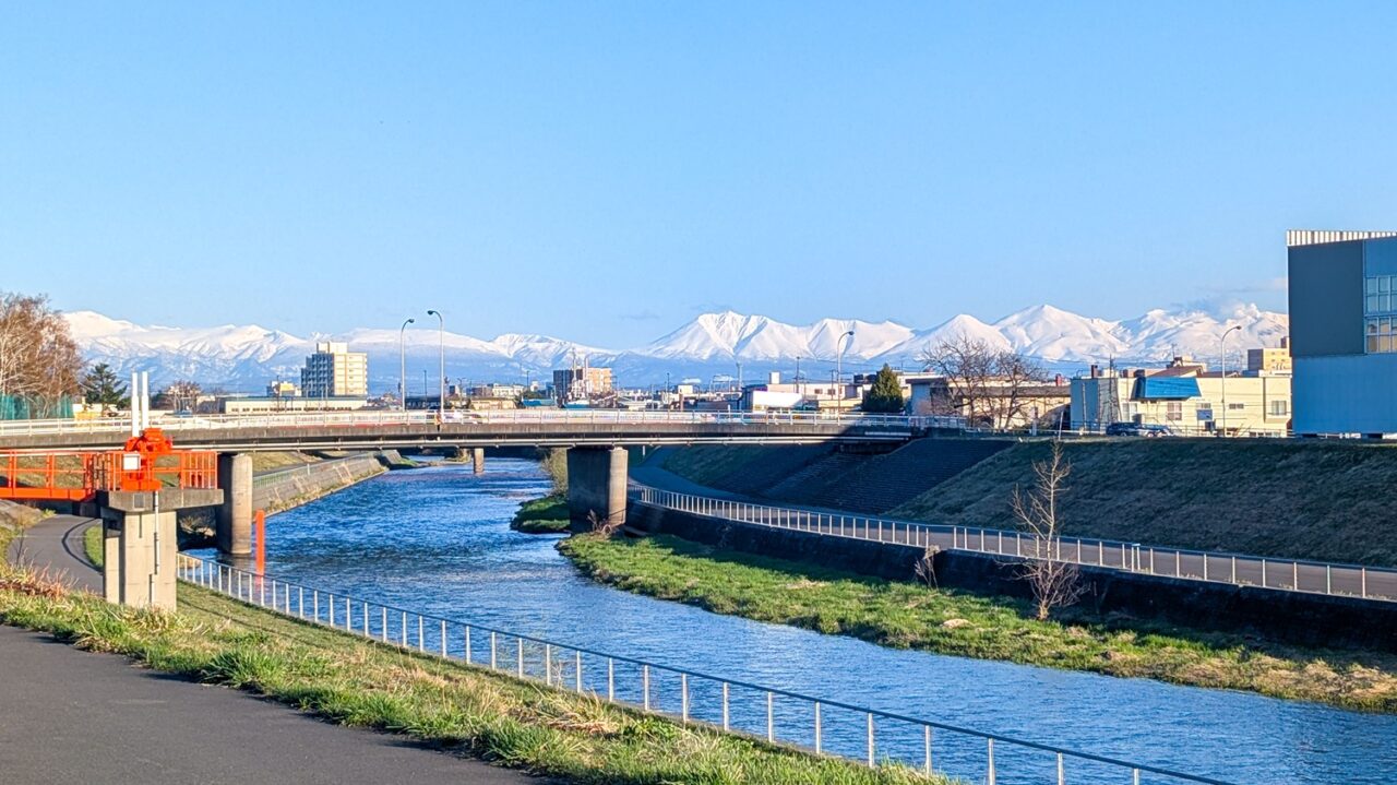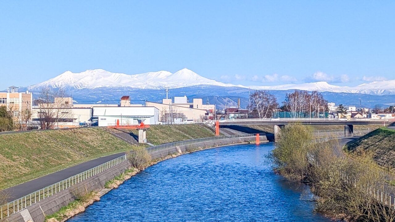 2026年4月から6月上旬ごろまで、10条通周辺の牛朱別川では、青空と大雪山連峰の雪山のコントラストといった絶景を楽しむことができます。永隆橋近くの土手よりの風景です。澄んだ空気の中のウォーキングはとても心地よく、川沿いの春の景色と大雪山のくっきりとした雪山の景色は、まさに絶景とも言えます。いろいろな角度から見られますので、ぜひ散歩がてら晴れた日は雪山もご覧ください。
