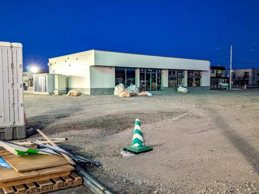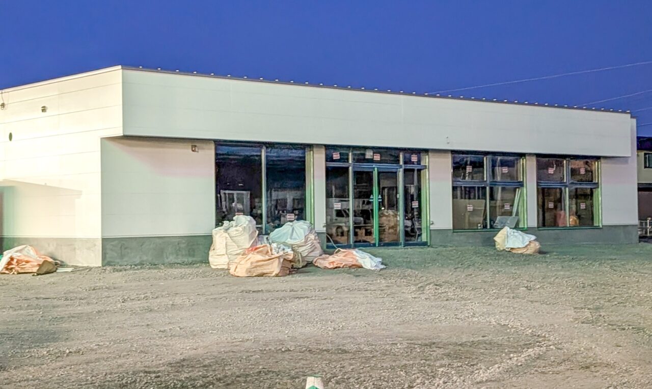 入口は自動ドアとなっており、1階建てのこの形はコンビニの形に似ていますね。ローソンの公式の求人情報に「旭川大町1条」と記載がありました。大町のローソンは「旭川大町3条店」しかなく、記載されていた住所が「北海道旭川市大町1条6丁目14-259」とあることから、建設中の建物の場所とも一致しています。どうやらこの建物はローソンのようです。