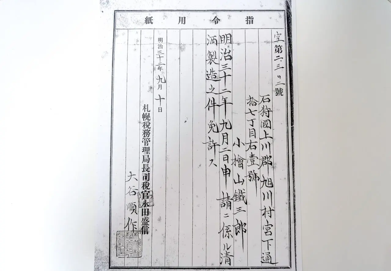 旭川の老舗中の老舗、宮下通の中でも屈指の歴史ある酒造会社「髙砂酒造」さんに、創業時の酒造免許の許可証を見せていただきました。髙砂酒造は、1899年(明治32年)の会社創業以来127年間、宮下通17丁目のこの場所から動くことなく酒造を続けています。